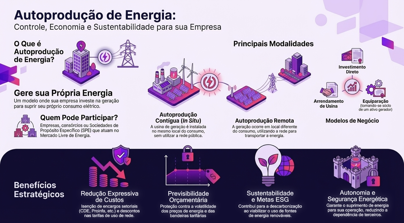Como vimos, a autoprodução de energia é muito mais do que uma simples forma de economizar na conta de luz. É uma estratégia completa oferecem controle de custos, segurança e sustentabilidade. Exploramos o que é um autoprodutor, as diferentes formas de gerar energia, seja no local de consumo (contígua) ou à distância (remota), e os vários modelos de negócio para participar, como investimento direto, consórcio, arrendamento ou equiparação.