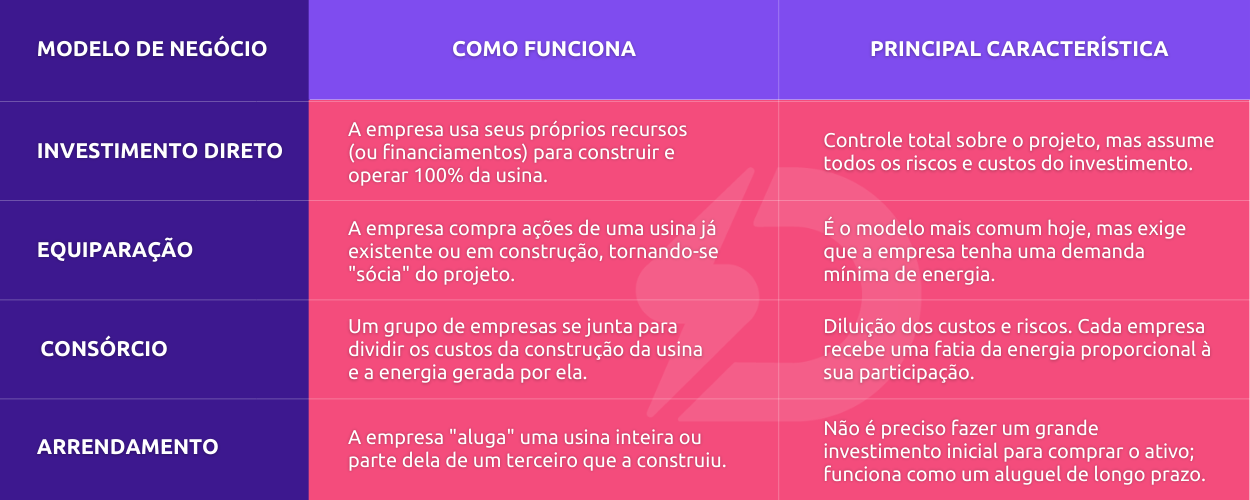 Uma empresa não precisa construir e operar uma usina sozinha. Existem diferentes “receitas” para se tornar um autoprodutor, cada uma com suas características. A tabela abaixo resume as quatro principais:
